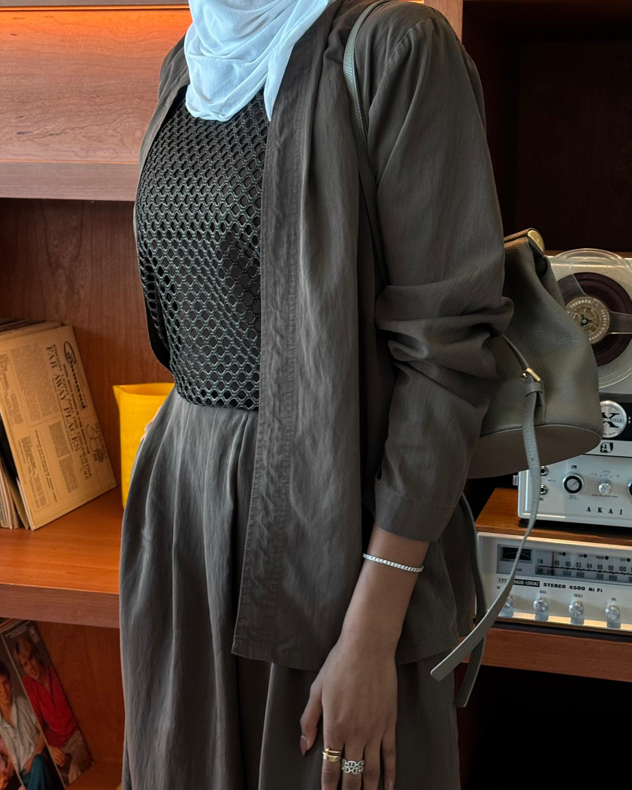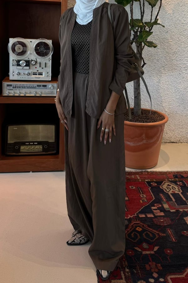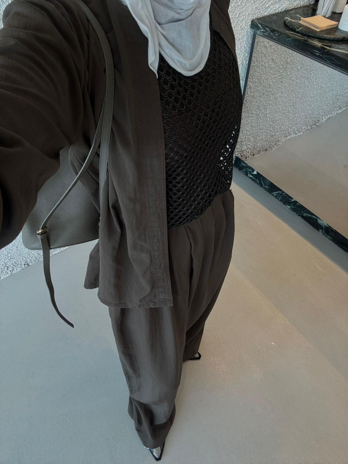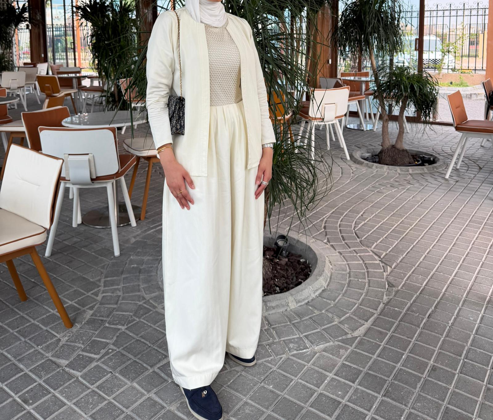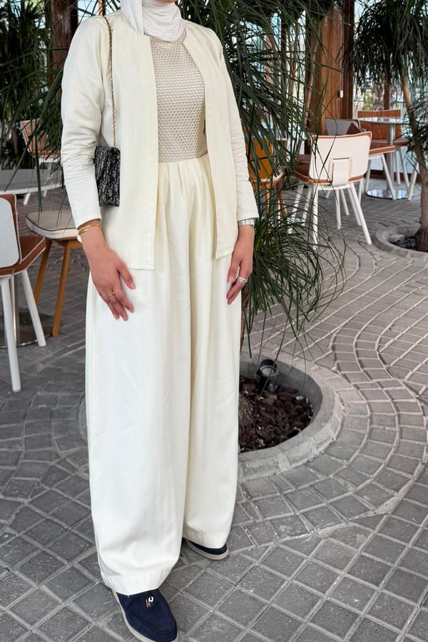 An elegant modest ensemble featuring a lightweight open jacket over a textured net-style top and a flowing wide pant