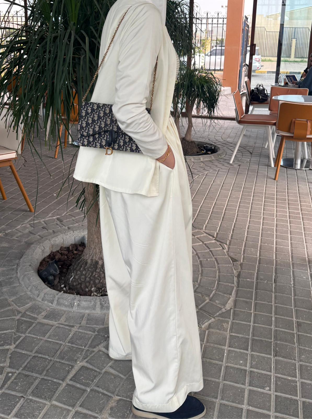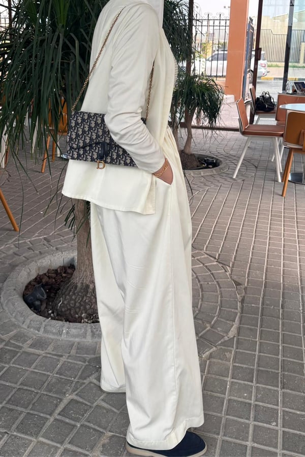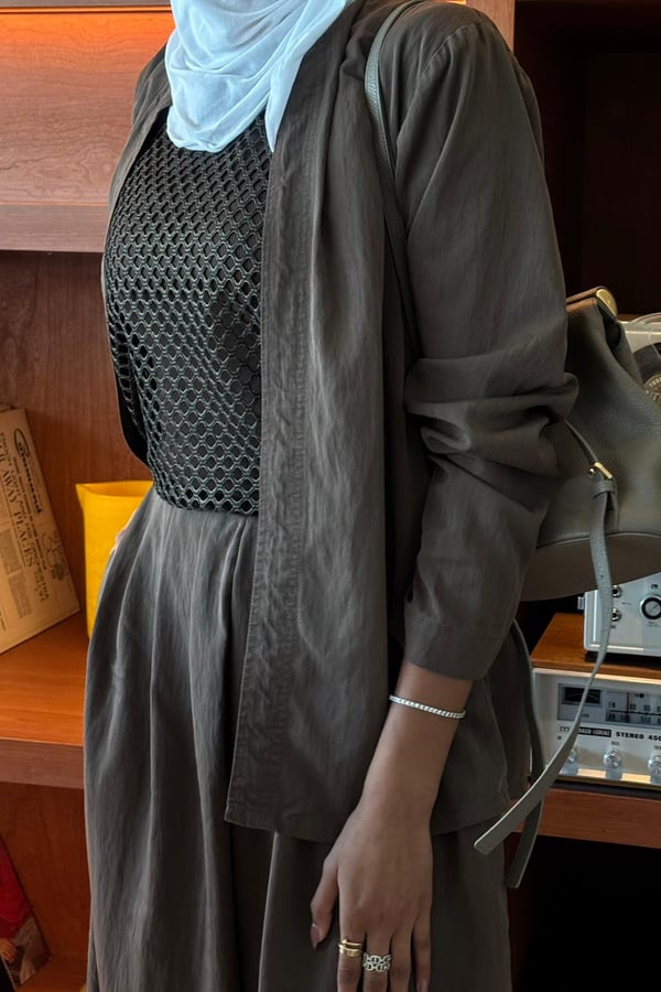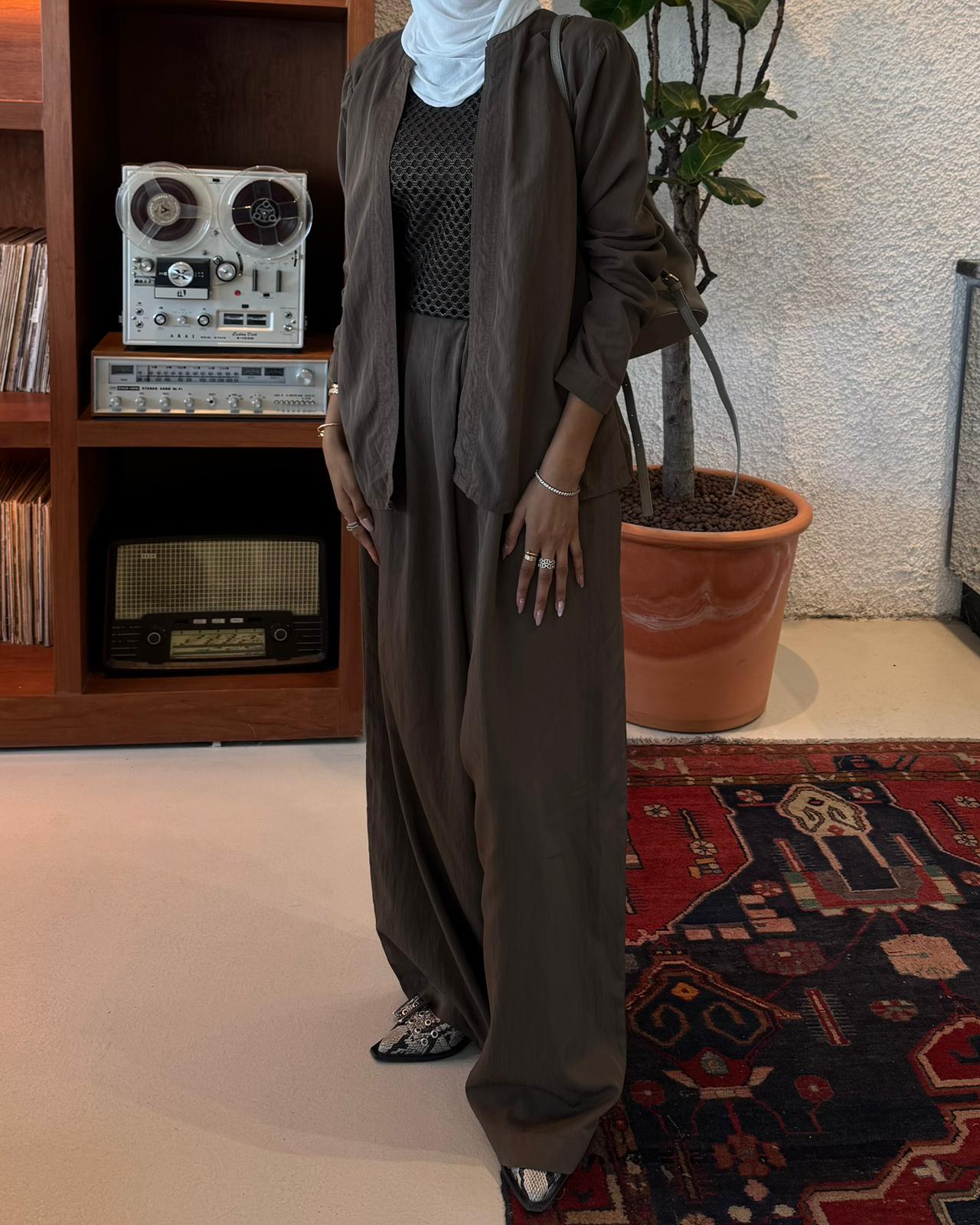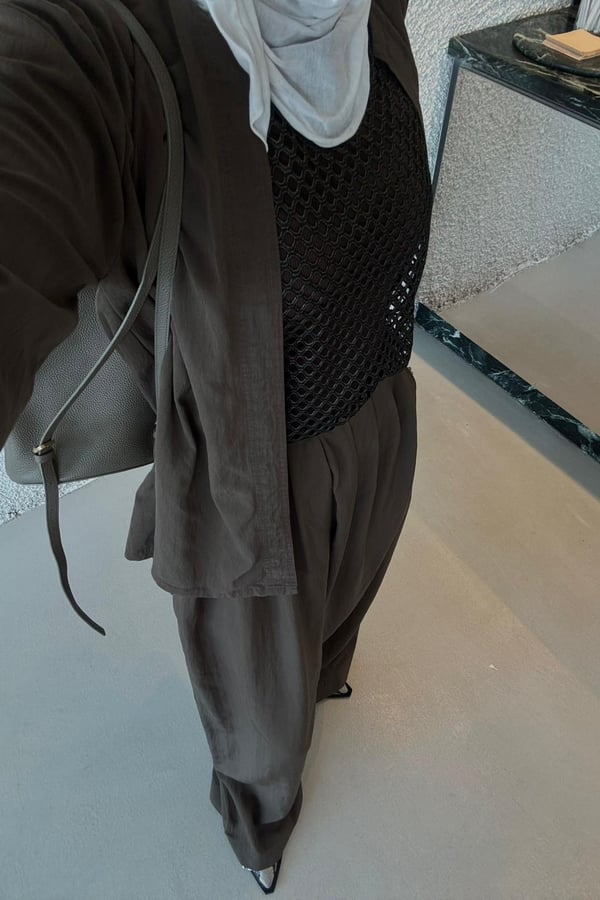 An elegant modest ensemble featuring a lightweight open jacket over a textured net-style top and a flowing wide pant